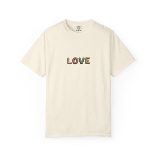 LOVE Retro Crochet Graphic T-Shirt — Vintage Earth-Tone Casual Tee
