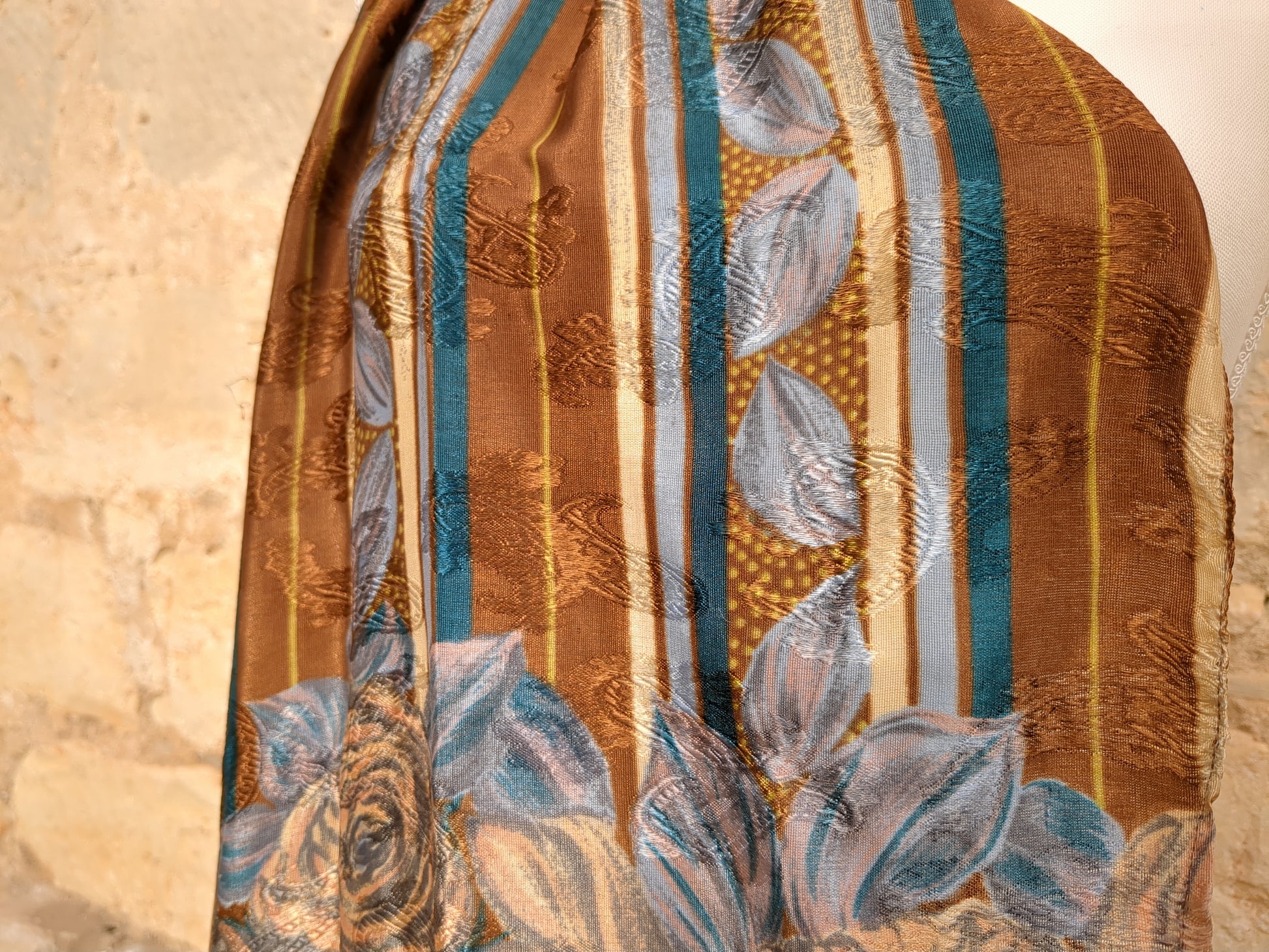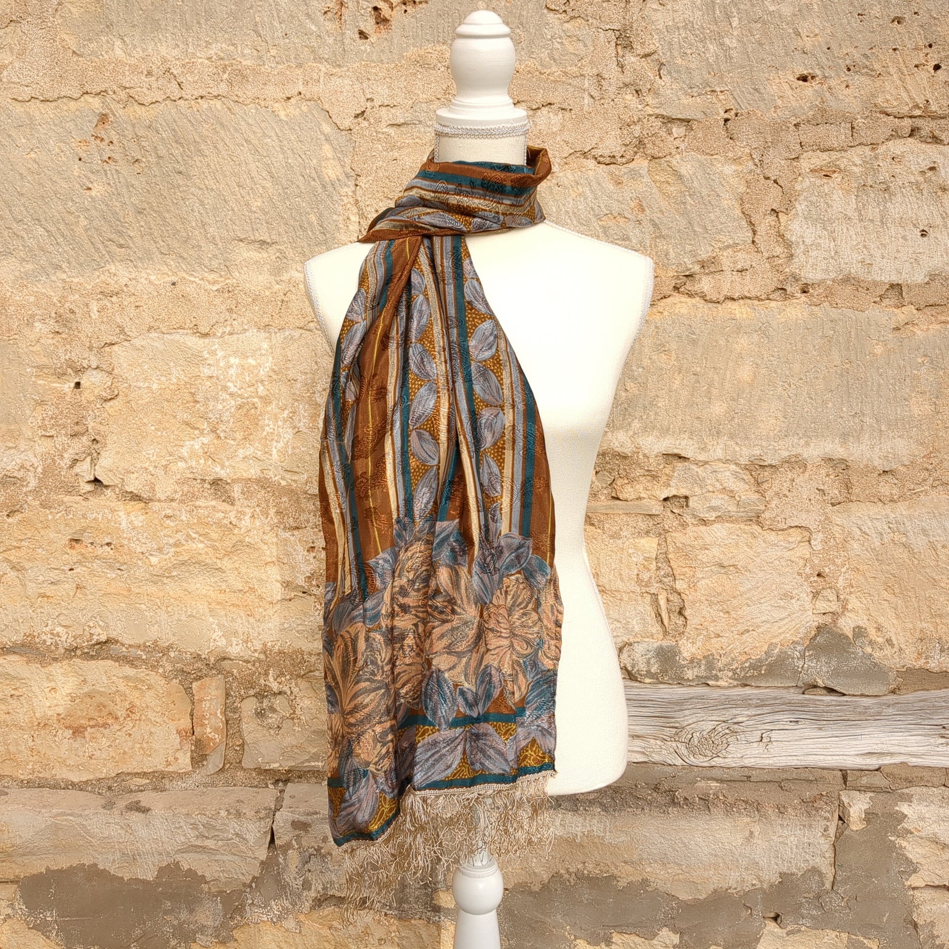 This lovely long scarf features colors of teal, brown, yellow, and gray. Having a beige fringe, it also has tangible paisley patterns all along the scarf for a decadent look and feel.